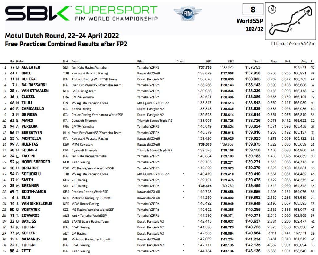 Il capitolo Supersport vede ancora una volta Dominique Aegerter sugli scudi: il tempo di 1’37”753 consegna la leadership a lui e al team Yamaha Ten Kate, che affronta la gara di casa. Alle sue spalle si conferma veloce Can Oncu incalzato dalla coppia italiana formata da Nicolò Bulega e Lorenzo Baldassarri. Ancora molto rapido Glenn Van Straalen, pilota olandese in grande spolvero già ad Aragon. Top-10 per Federico Caricasulo, Raffaele De Rosa e Stefano Manzi, con Yari Montella tredicesimo.