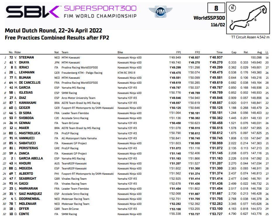 Quanto alla Supersport 300, l’aria di casa sembra galvanizzare Victor Steeman che conquista la testa della classifica in 1’48”937. L’alfiere di Kawasaki MTM ha preceduto il teammate Yuta Okaya e Bruno Ieraci, primo in FP1. La rivelazione di Aragon Lennox Lehmann è quarta, con Ruben Bijman al quinto posto.