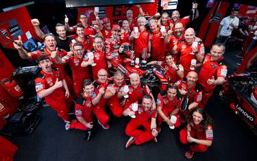 Ducati, festa nel box dopo la vittoria di Bagnaia