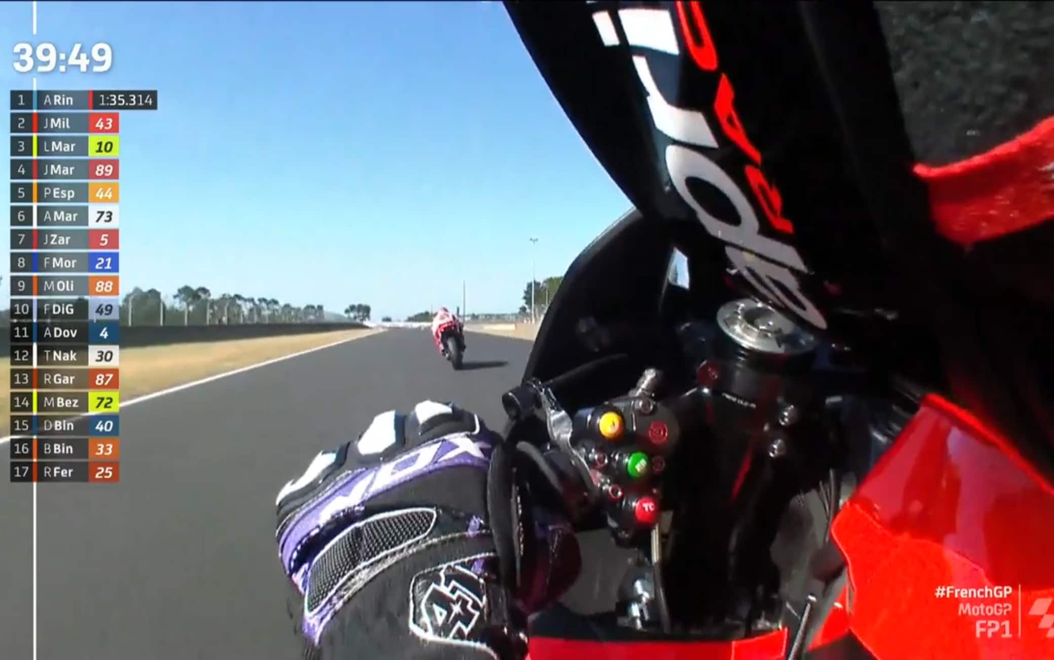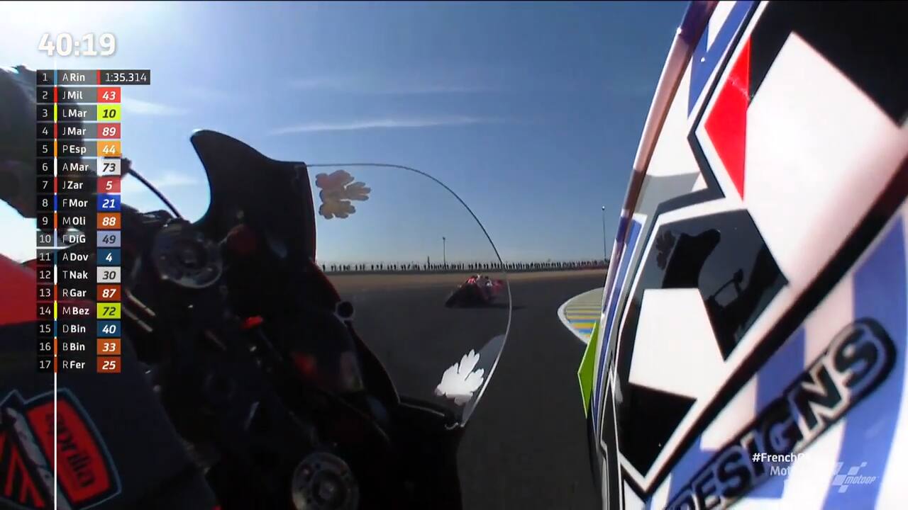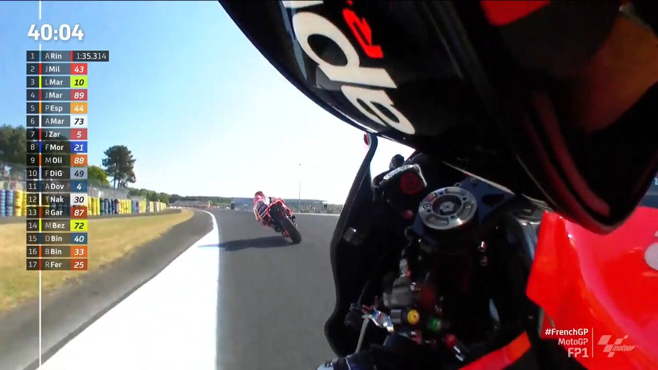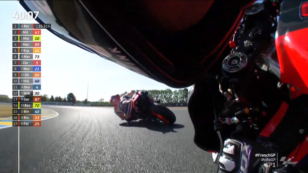 Nelle prove libere del GP Francia, Aleix Espargaró è andato in pista con una "shoulder cam", una telecamera che permette di apprezzare la visuale del pilota in soggettiva. Il risultato ricorda molto la visuale in prima persona tipica dei videogiochi. Un esperimento che consente di "ammirare" il lavoro del pilota in sella. Gli orari delle gare, in diretta domenica 15 maggio su Sky Sport MotoGP, Sky Sport Uno e in streaming su NOW: Moto3 alle 11, Moto2 alle 12.20, MotoGP alle 14