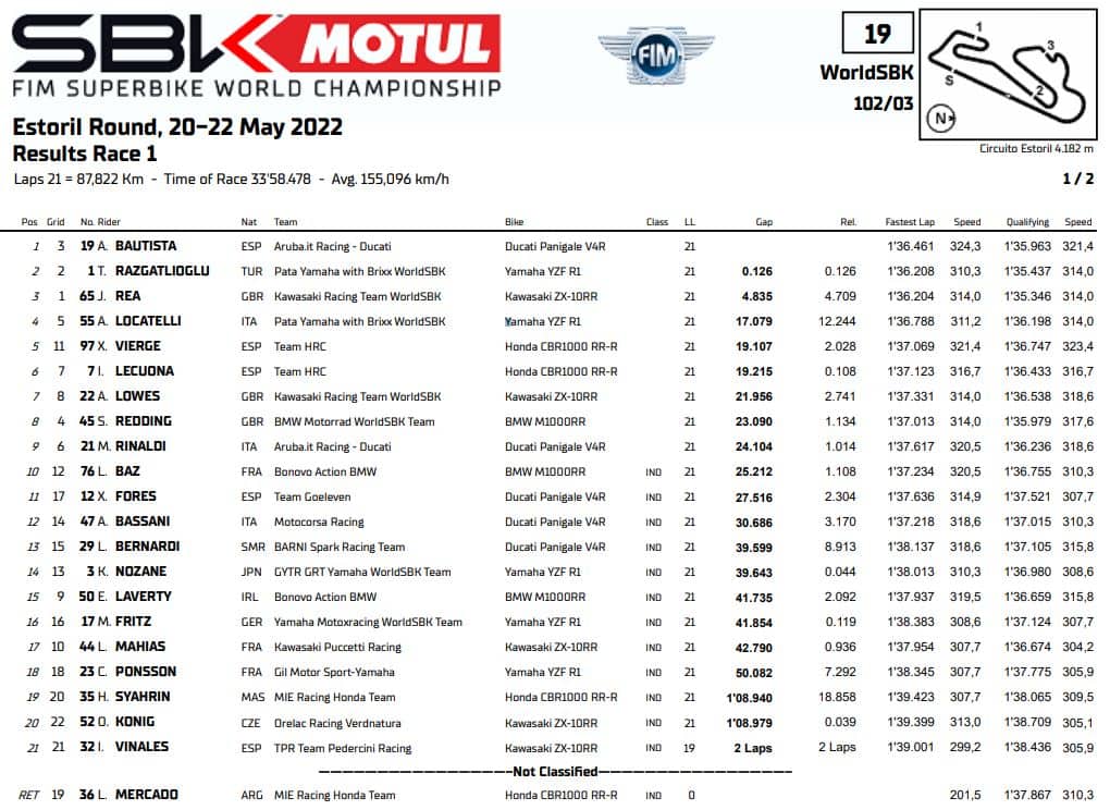 Un errore alla prima curva ha complicato la gara dello spagnolo, ritrovatosi quarto alle spalle di Andrea Locatelli non riuscendo a superarlo prima di qualche giro. Nel frattempo, Rea e Toprak sono scappati in fuga lottando senza esclusione di colpi per la prima posizione. Complice la battaglia tra i leader, ma soprattutto grazie a un ritmo gara pazzesco (costantemente sul 1’36” alto), Bautista ha ricucito un gap di quasi tre secondi sfilando Rea (finito lungo alla curva 1) e bruciando Razgatlioglu di motore proprio sotto la bandiera a scacchi.