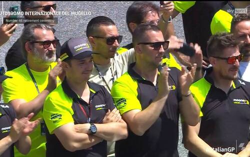 Sul nastro d'asfalto del rettilineo erano presenti tutti i suoi amici, meccanici, tecnici e team manager delle altre squadre che lo hanno voluto celebrare con un lunghissimo applauso. Davanti a tutti, invece c'era l'intero team Mooney VR46, la sua scuderia che adesso rappresenta il suo futuro nel motomondiale.