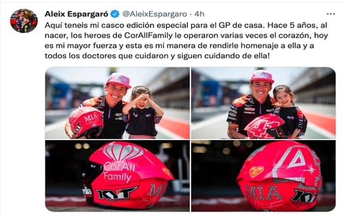 Aleix Espargaró ha pensato a un casco speciale per il Gp di Catalunya, quello “di casa” sua. Il pilota dell’Aprilia lo ha dedicato alla figlia Mia, operata al cuore poco dopo la nascita per un problema congenito e alla CorAll Family, l’associazione che l’ha aiutata.