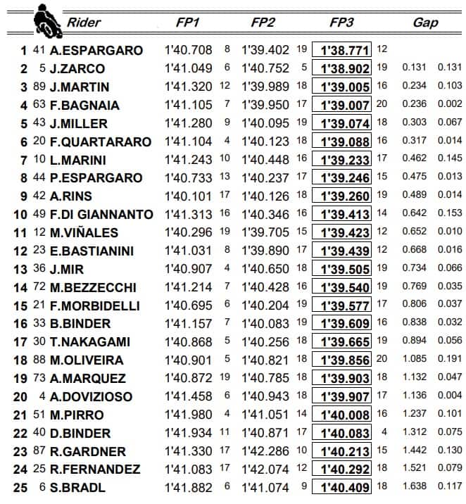 gp catalunyaDopo aver dominato le Libere del venerdì a Barcellona, Aleix Espargaró è il più veloce con l'Aprilia anche nella terza sessione di prove. A seguire quattro Ducati: prima i piloti del team Pramac (2° Zarco, 3° Martin) e poi i piloti della squadra ufficiale (4° Bagnaia, 5° Miller). La prima moto non italiana è la Yamaha di Quartararo (6°). Libere 3 alle 13:30, qualifiche alle 14:10. La gara della MotoGP domenica alle 14 in diretta su Sky Sport MotoGP (canale 208) e in streaming su NOW