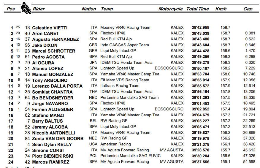 Era una gara essenziale dopo una serie di corse negative. Serviva un colpo di reni per raddrizzare la sua corsa verso il titolo. Con questa vittoria Vietti si consolida in testa alla classifica, con sedici punti di vantaggio su Ogura, settimo in gara, e ventiquattro su Canet. Dopo il successo del Mugello era atteso a una conferma Pedro Acosta ma lo spagnolo non ha saputo ripetersi. Il sesto posto a sei secondi dal vincitore non è male, ma da lui ci si aspetta sempre di più (cosa che per altro lo infastidisce non poco, a cominciare dai paragoni scomodi con i campioni della Motogp). Nemmeno Tony Arbolino torna casa contento. Non ha brillato in prova e nemmeno in gara, chiusa infine al decimo posto davanti al connazionale Dalla Porta. Ma la palma della delusione spetta a Joe Roberts, partito forte, scappato via fino ad accumulare oltre due secondi di vantaggio sugli inseguitori per poi buttare tutto nelle ghiaia di Montmelò. Fine analoga a quella di Lowes: ennesima caduta del britannico, a due giri dal termine.