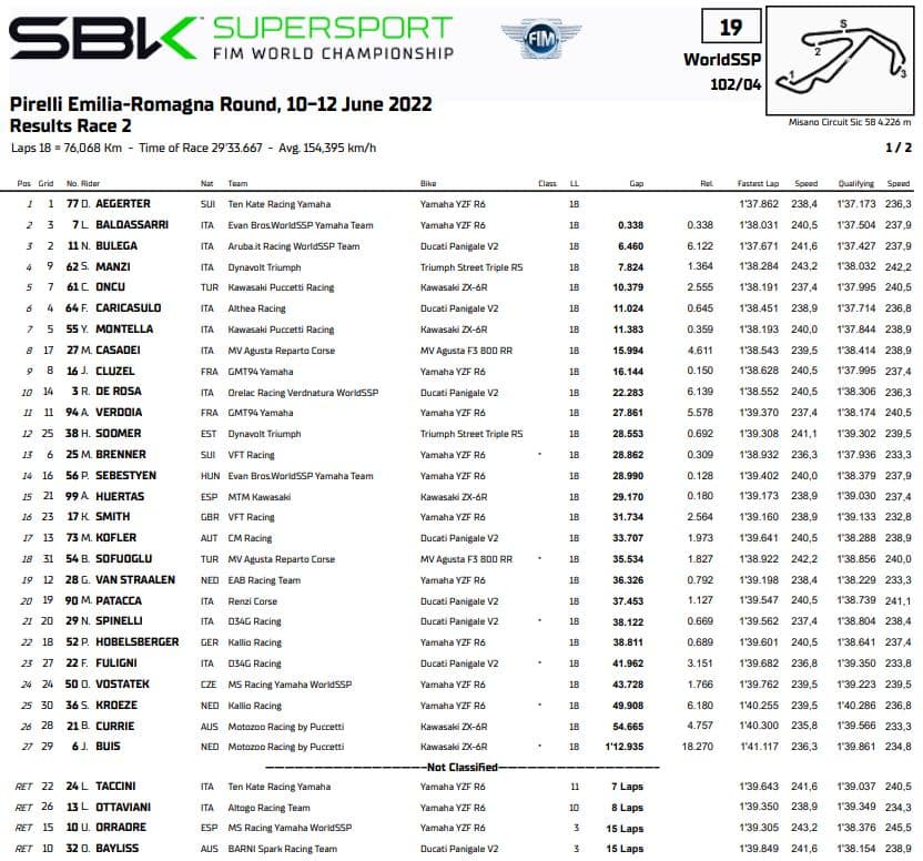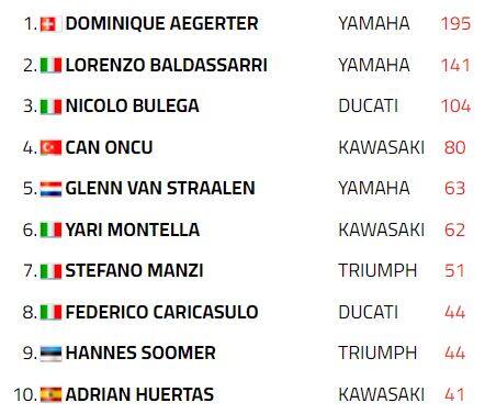 A nulla sono valsi gli sforzi dell’italiano per tornare sotto, complice un lieve problema al cambio. Aegerter sale così a sette successi consecutivi, mentre a chiudere il podio è Nicolò Bulega: il ducatista ha pagato un lungo al primo giro che lo ha obbligato a una gara in rimonta. Quarto Stefano Manzi al miglior risultato stagionale, quinto Can Oncu davanti a Federico Caricasulo e Yari Montella. Buon ottavo posto per Mattia Casadei, con Jules Cluzel e Raffaele De Rosa a chiudere la top-10.