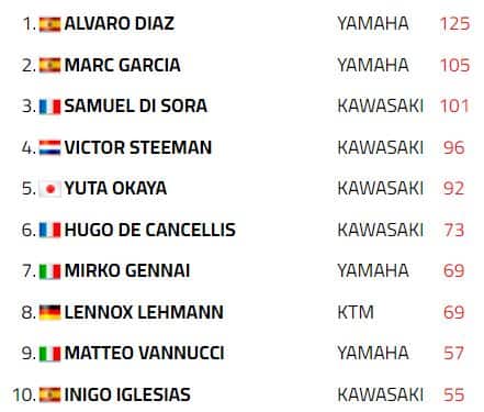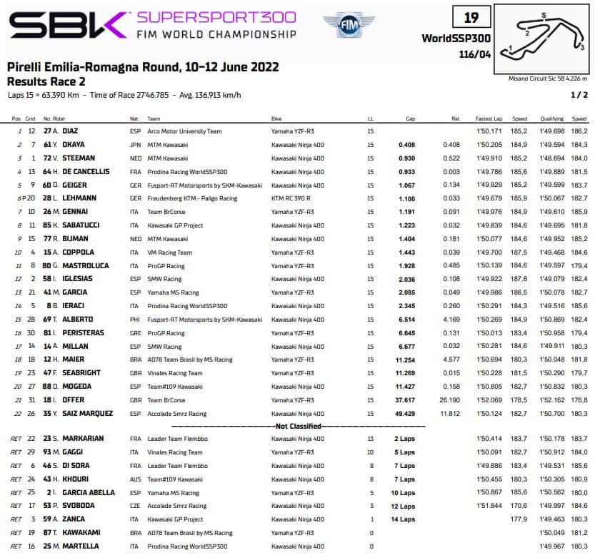 In Supersport 300 è stato Alvaro Diaz a fare la voce grossa, in assenza di Matteo Vannucci (caduto nel warm up e portato in ospedale per accertamenti). Lo spagnolo ha sfruttato il ritiro di Samuel Di Sora e la gara opaca di Marc Garcia (8°) per allungare in classifica grazie ai venticinque punti della vittoria, ottenuta in una gara di gruppo precedendo Yuta Okaya e Victor Steeman. Mirko Gennai è il migliore degli italiani in settima posizione, seguito da Kevin Sabatucci. Decimo Alfonso Coppola davanti a Gabriele Mastroluca, quattordicesimo Bruno Ieraci.