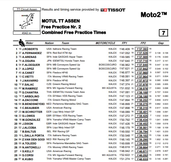 Joe Roberts davanti a tutti. L’americano torna protagonista nelle libere di Assen, ma Fernandez, scivolata a parte, ha confermato di essere in crescita, dopo la vittoria in Germania, piazzandosi alle spalle dell’americano e davanti ad Albert Arenas. Ogura con il quarto tempo apre la sfida al podio insieme allo spagnolo della Ktm, per dare una svolta al campionato dove il giapponese insidia la vetta staccato di otto punti e Augusto insegue al terzo posto, distanziato di dodici lunghezze.