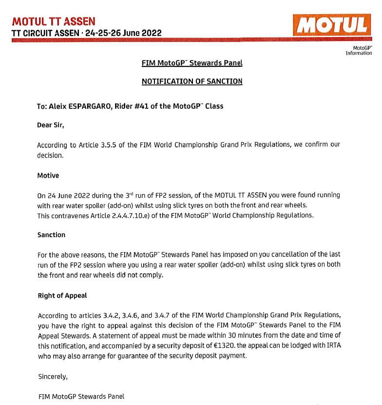 GP Olanda, cancellato il 2° tempo nelle Libere ad Aleix Espargaró per doppio spoiler