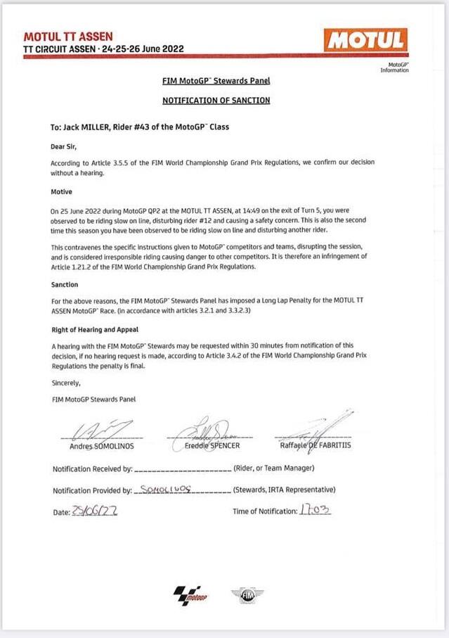 Il comunicato dello "Stewards Panel" che ufficializza la sanzione per Miller: long lap penalty nel GP Olanda