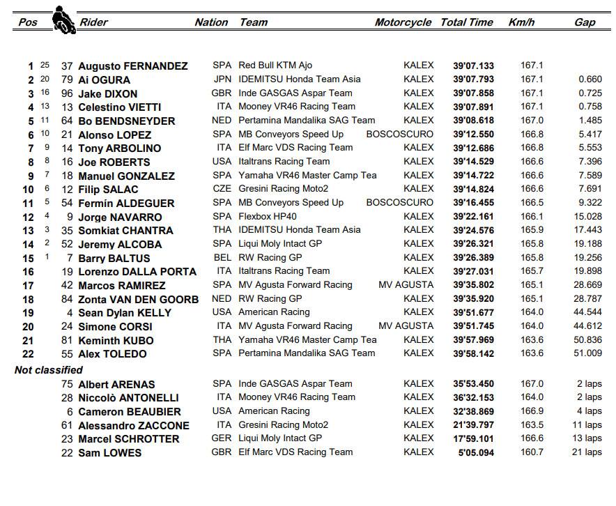 Rimpianti invece per Sam Lowes: scattava dalla prima fila, è andato largo alla prima curva, per poi sdraiarsi. Rimpianti anche per Lopez, finito sesto dopo una gara da