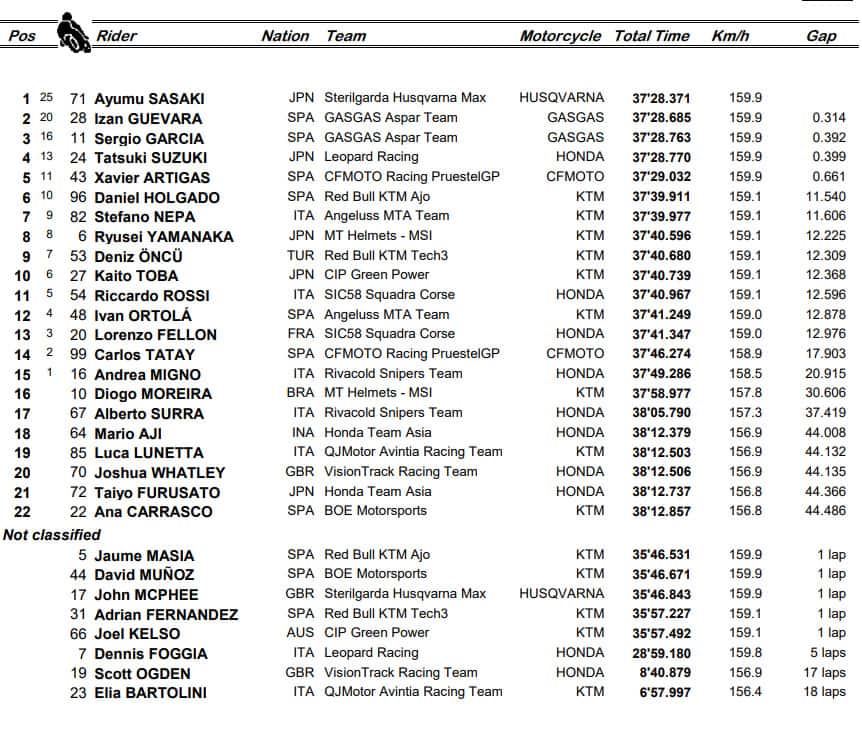 Sasaki, il miracolato, dopo aver sfiorato il dramma al Mugello (travolto da Masia dopo essere caduto in prova), operato alla clavicola, rientrato in gara in Germania con un quarto posto che sapeva già d’impresa, ha vinto in Olanda. E che vittoria. La prima in carriera, dopo un duello serrato nel finale con il connazionale Suzuki e il fenomeno Guevara. Lo spagnolo ha agguantato un terzo posto insperato dopo aver iniziato l’ultimo giro fuori dalla zona podio. Izan ha dominato per tutta la gara, duellando con un arrembante Munoz e i due giapponesi, ma un errore nel finale gli ha fatto perdere terreno.