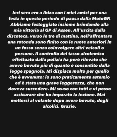 Alle 21:12 di martedì 5 luglio Bagnaia ha postato un messaggio sui social per chiedere scusa dell'incidente a Ibiza: "Ieri sera ero a Ibiza con i miei amici per una festa in questo periodo di pausa dalla MotoGP. Abbiamo festeggiato insieme, brindando alla mia vittoria nel GP di Assen. All'uscita dalla discoteca, verso le 3 di mattina, nell'affrontare una rotonda sono finito con le ruote anteriori in un fosso, senza coinvolgere altri veicoli o persone. Il controllo del tasso alcolemico effettuato dalla Polizia ha però rilevato che avevo bevuto più di quanto è consentito dalla legge spagnola. Mi dispiace molto per quello che è avvenuto: io sono praticamente astemio, è stata una grave leggerezza, che non doveva succedere. Mi scuso con tutti e vi posso assicurare che ho imparato la lezione. Mai mettersi al volante dopo avere bevuto degli alcolici. Grazie".