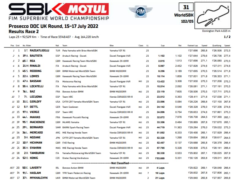 sbkDopo le vittorie in Gara 1 e nella Superpole Race il pilota turco della Yamaha completa il suo weekend perfetto a Donington conquistando il successo anche in Gara 2: il campione del mondo in carica ha preceduto sul traguardo la Ducati di Alvaro Bautista e la Kawasaki del sei volte campione del mondo della categoria Jonathan Rea. Quarto Rinaldi, davanti a Redding, Lowes, Bassani e Locatelli. Completano la top ten Baz e Lecuona