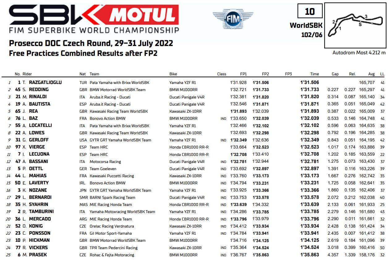 Alle sue spalle stupiscono Scott Redding su BMW e Michael Rinaldi su Ducati. L’inglese viene dal bel weekend di casa e in Repubblica Ceca ha vinto Gara 2 nel 2021, mentre il riminese ha mostrato grande velocità soprattutto nella seconda metà della pista. Quarto tempo per Alvaro Bautista davanti a Jonathan Rea, che non ha migliorato il crono della mattinata (un 1’31”8 che gli era valso la prima posizione).