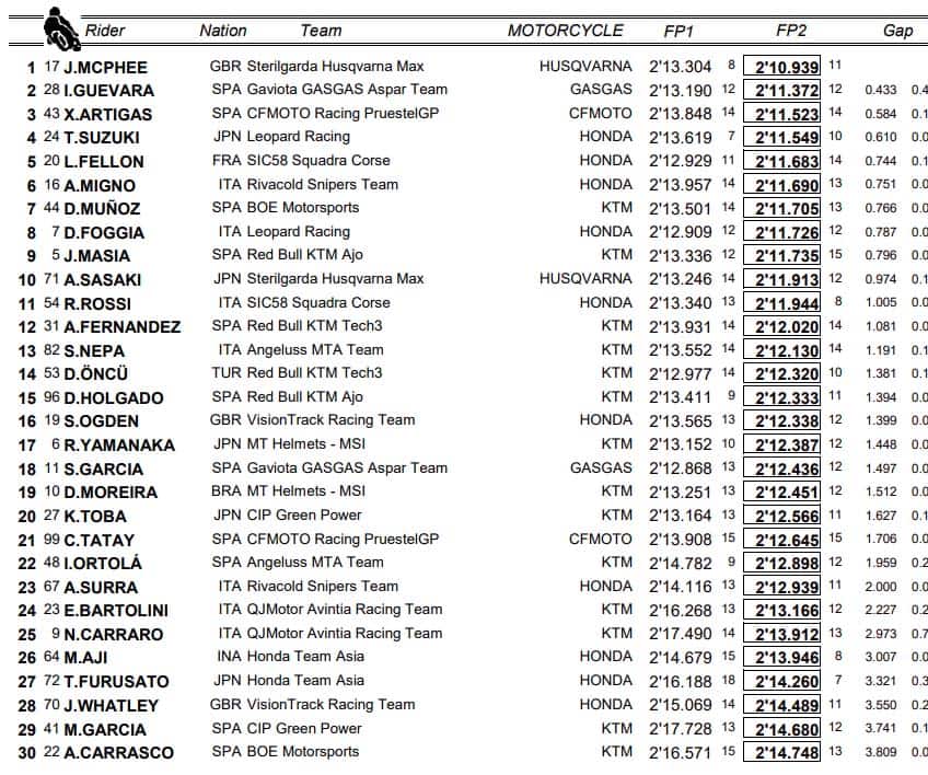 Al giro di boa l’attenzione è concentrata sul binomio Gas Gas, in vetta al mondiale con soli tre punti a separarli. Izan Guevara è partito col piede giusto, decisamente meglio di Garcia, sia con gomme durre che con gomme morbide. Hanno preso direzioni di lavoro diverse, i due galletti spagnoli, e per ora Izan, con il secondo tempo della combinata, alle spalle di McPhee, dimostra di aver ripreso dove aveva lasciato. Nelle ultime quattro gare, il secondo nel mondiale, ha guadagnato 40 punti al rivale che sente il fiato sul collo del compagno di squadra; oggi Sergio è finito molto indietro, ventinovesimo e staccato di oltre 3 secondi.