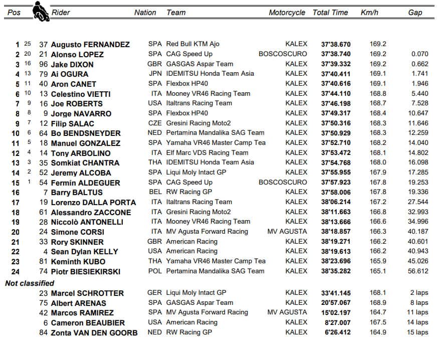 Fernandez vive un momento ideale, è in forma perfetta e motivato. Ma anche Ogura è un brutto cliente. Il giapponese ha chiuso al quarto posto, liberandosi di un aggressivo Canet nel finale. Vietti invece non è mai stato della partita per il podio. Gara da archiviare anche per Tony Arbolino, che ha patito la caduta di Arenas, chiudendo la gara al dodicesimo posto. Per la cronaca non hanno tagliato il traguardo anche Ramirez, Beaubier e Van de Goorbergh. Fuori dai punti tutti gli altri italiani: Dalla Porta 17°, Zaccone 18°, Antonelli 19° e Corsi 20°.