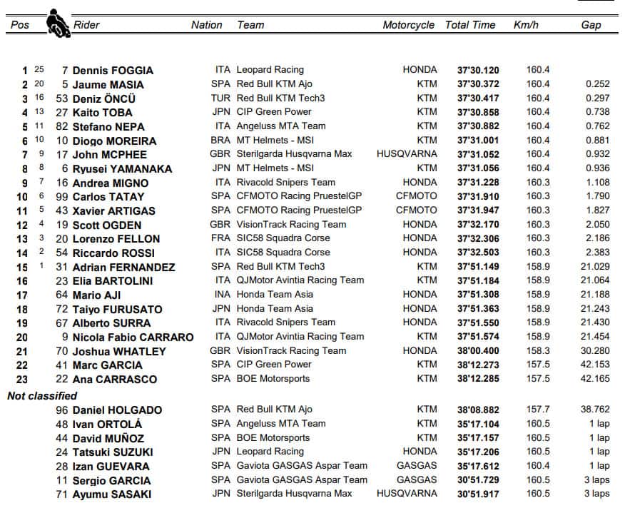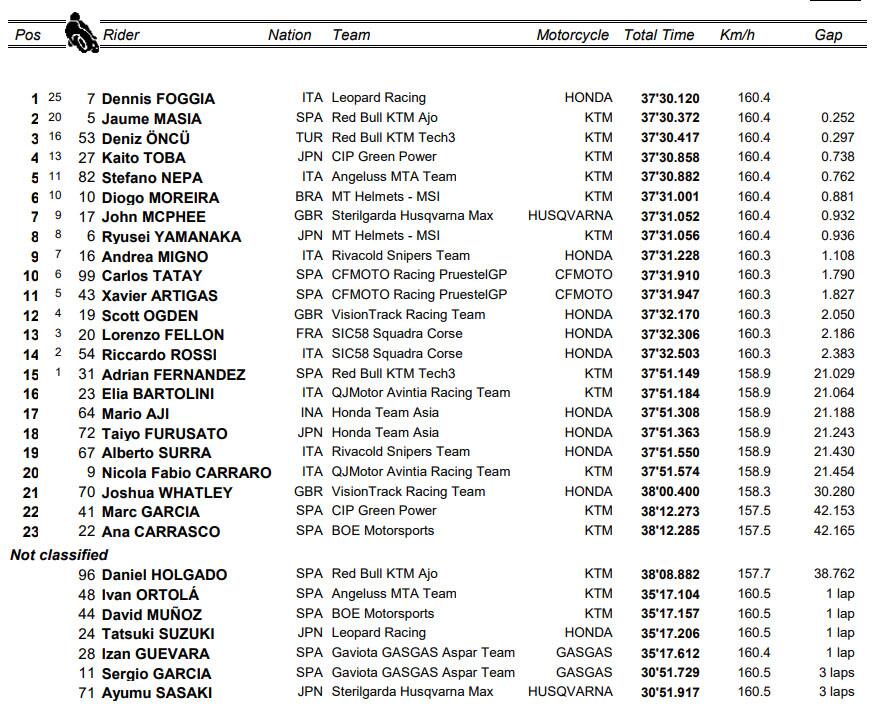 Fuori i due leader del mondiale: prima Garcia, steso da Sasaki al 14°, poi Guevara, centrato da Ortola nelle ultime curve. Il successo di Dennis riapre di fatto la corsa al titolo. Dai 66 punti di svantaggio prima del via Foggia si ritrova a 42 lunghezze da Garcia, che mantiene un piccolo vantaggio, solo 3 punti, su Guevara che partiva in pole position e sembrava il favorito per il successo finale. Nell’ultimo terzo di gara Izan ha invece perso il ritmo, mentre Garcia che navigava intorno alla nona posizione riusciva a trovare il passo per avvicinarsi al gruppo di testa. Dennis che ha lottato con Oncu, Masia e Sasaki, a metà corsa aveva persino tentato la fuga, portando il suo vantaggio a sei decimi su Suzuki. Si è fatto riprendere e al 13° giro ha anche commesso un errore che poteva compromettere il podio. Una staccata troppo larga ha aperto la porta a Oncu, Ortola e Masia, poi seguito anche da Suzuki.