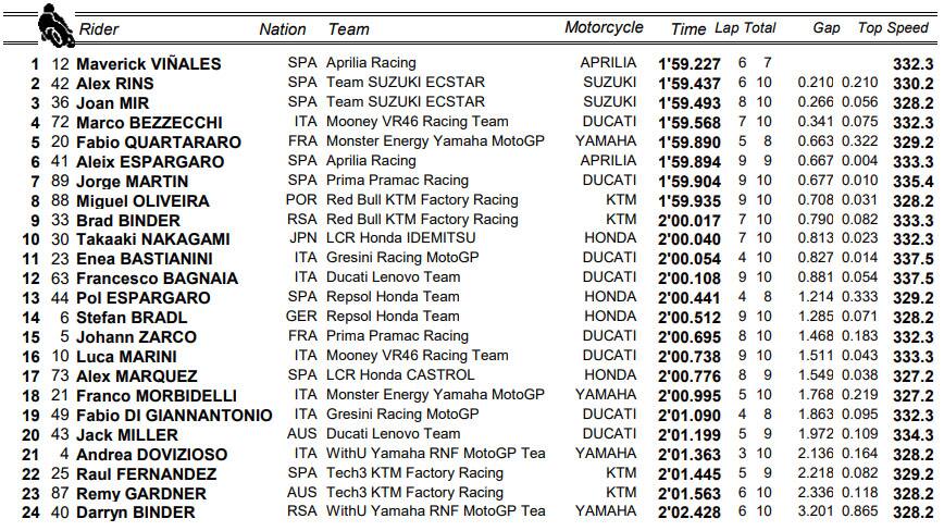 E' rimasto molto in pista Aleix Espargaró, che ha voluto testare le sue condizioni fisiche dopo la brutta caduta di sabato nelle libere. Lo spagnolo ha stretto i denti e provato a forzare in vista della gara, in programma alle 14, raccogliendo il 6° crono complessivo. Il pilota Aprilia ha deciso, in accordo con il team: parteciperà alla gara. Undicesimo Bastianini, seguito dall'altra Ducati di Bagnaia. Caduta senza conseguenze per Pol Espargaró.