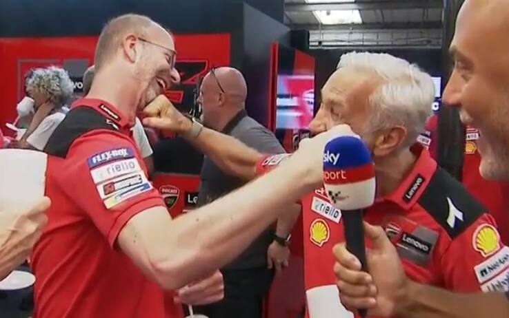 Bagnaia vince a Silverstone, Miller chiude in terza posizione, e nel box Ducati scatta la festa dopo il traguardo. Dall'Igna scatenato innaffia i suoi piloti con il Prosecco, mentre "Rocky" Tardozzi non trattiene la gioia e si scaraventa simpaticamente contro l’ingegnere Davide Barana