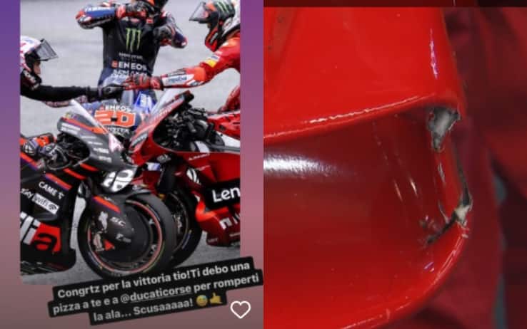 su instagramA fine GP d'Austria Aleix Espargaró, avvicinandosi a Bagnaia per fargli i complimenti dopo la vittoria, ha toccato per sbaglio la Ducati del torinese, danneggiandone l'ala. Su Instagram le scuse dello spagnolo: "Vi devo una pizza". Dall'Igna scherza: "Sarebbe meglio se si facesse perdonare con un paio di cene a base di pesce..."