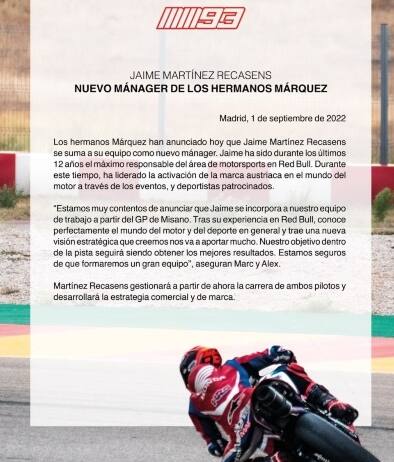 Con una storia pubblicata su Instagram, Marc Marquez ha annunciato il nome del suo nuovo manager, che prende il posto di Emilio Alzamora: si tratta di Jaime Martinez Recasens. Gestirà la carriera dei due fratelli Marquez (Alex e Marc, entrambi piloti MotoGP), le loro operazioni commerciali e i loro contratti legati al marketing. "Jaime è stato a capo della divisone Motorsport di Red Bull negli ultimi 12 anni, ci offrirà una nuova visione strategica", scrive Marc sui social