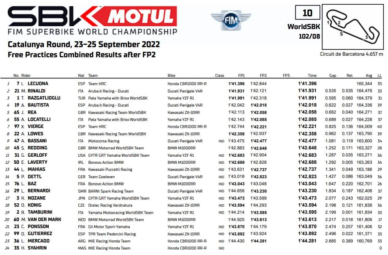 Un sorprendente Iker Lecuona chiude in prima posizione il venerdì di prove libere del round Superbike di Barcellona. Lo spagnolo di casa Honda approfitta delle ottime condizioni della FP1 per una serie di time attack che gli sono valsi il tempo di 1’41”396, sotto il record della pista in gara. Per Lecuona e il suo compagno di squadra Xavi Vierge (7°) la pista catalana rappresenta una ghiotta occasione: già l’anno scorso Alvaro Bautista andò a podio con la CBR1000RR-R in Superpole Race e anche quest’anno la gara corta potrebbe essere terreno di conquista