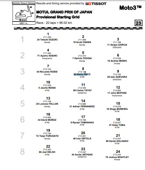 Scintille in piste tra i due compagni di squadra, Garcia e il leader del mondiale Guevara. Un incrocio di traiettorie a bassa velocità ha scatenato sguardi in tralice e gesti eloquenti. Il secondo in classifica s’è preso una piccola rivincita, rifilando quattro decimi al rivale, nonostante una scivolata a due minuti dal termine. Guevara si è accomodato in terza fila col il nono tempo ma i 33 punti di vantaggio su Sergio gli assicurano un certo agio per la gara. "Non mi trovavo bene sulla moto, poca confidenza con la pioggia, ma la pista è bellissima", ha spiegato Izan che conta su condizioni meteo migliori per domenica. Pronostico aperto quindi per la gara su cui qualche pensierino lo sta facendo anche Auymu Sasaki che scatta dal quarto posto, davanti al pubblico di casa, e in classifica minaccia il terzo posto di Foggia staccato di soli 13 lunghezze. Chance anche per Andrea Migno tornato in seconda fila, con il sesto tempo, dopo una serie di prestazioni negative (tre zeri nelle ultime tre gare) e per Riccardo Rossi che ha agguantato un promettente settimo posto in griglia, davanti a Dennis Oncu. Caduto Munoz, in difficoltà Moreira sul bagnato finito insieme allo spagnolo in sesta fila con il sedicesimo tempo, la sorpresa del sabato giapponese è il diciottenne inglese Scott Odgeon capace di agguantare la seconda posizione. Nonostante la pista bagnata non è invece emerso McPhee (dodicesimo) e si è difeso un po’ meglio Dennis Oncu, che però non è andato oltre l’ottavo posto. In difficoltà Stefano Nepa, relegato in penultima fila da dove partirà dalla venticinquesima casella.