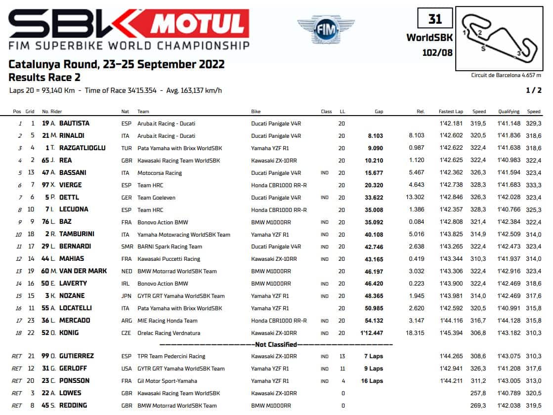 In Gara 2 Bautista è scattato dalla pole position e ha fatto gara a sé, arrivando all’ultimo giro con dieci secondi di vantaggio su Rinaldi prima di chiudere il gas per festeggiare. Impossibile pareggiare la sua prestazione sia nei tempi sul giro, sia nella “dolcezza” con le gomme, da gestire con molta attenzione sulla pista catalana. Per Alvaro è la prima tripletta da Aragon 2019 e Ducati può anche festeggiare il primo uno-due di stagione con il secondo posto di Rinaldi. Il riminese ha infatti condotto una gara intelligente, che lo ha visto lottare con Rea e con Axel Bassani senza però chiedere troppo alle Pirelli. Un errore di Johnny nelle ultime fasi gli ha dato respiro e gli ha permesso di gestire un piccolo margine su Razgatlioglu, terzo al traguardo. Rea ha chiuso quarto davanti a Bassani, perdendo la possibilità del secondo posto e contestualmente diversi punti dai suoi rivali in classifica. La migliore delle Honda è stata quella di Xavi Vierge in sesta posizione. Oettl ha infatti battuto Lecuona finendo settimo, mentre la top-10 ha premiato anche Loris Baz e Roberto Tamburini: il pilota di Yamaha Motoxracing ha beffato all’ultimo giro Luca Bernardi, comunque buon undicesimo. Locatelli è nuovamente scivolato alla curva dieci, riprendendo la via della pista e concludendo sedicesimo.