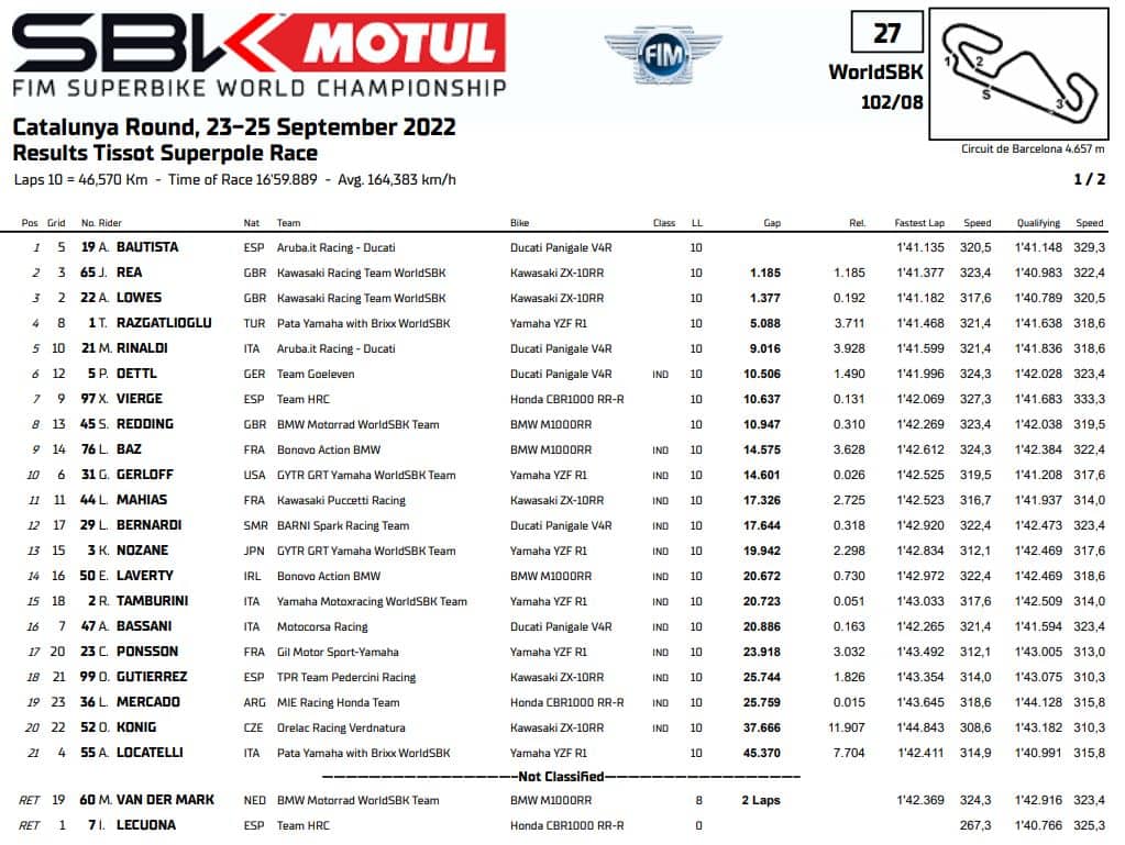 Domenica di dominio assoluto per Alvaro Bautista e Ducati sul tracciato di Barcellona, dove lo spagnolo ha condotto tutti i giri di tutte le gare del weekend. La sua giornata è partita con il successo in Superpole Race sulle Kawasaki di Jonathan Rea e Alex Lowes; quest’ultimo ha tenuto dietro il compagno di squadra fino all’ultimo giro e quando poi Rea l’ha sfilato, Lowes non ha interferito. Quarto posto per Toprak Razgatlioglu davanti a Michael Ruben Rinaldi, con un ottimo Philipp Oettl sesto. A terra al primo giro l’attesissimo Iker Lecuona e Andrea Locatelli.
