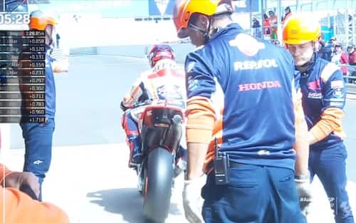 - Mancano poco meno di 5 minuti e 30'' alla fine delle qualifiche e Marc Marquez, avvisato dell'uscita di Bagnaia, non si fa pregare: salta in sella alla sua Honda...