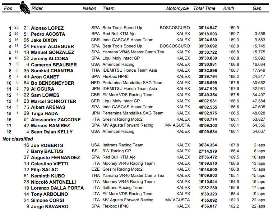 Ogura ha chiuso undicesimo (una sola posizione guadagnata, grazie alla caduta di Fernandez) e si è portato al comando del mondiale con 4,5 punti sullo spagnolo. Giornata nera anche per i piloti italiani: Arbolino che puntava al podio è caduto al sesto giro; Simone Corsi è finito addosso a Jorge Navarro scivolato davanti a lui al giro precedente. Vietti, Dalla Porta e Antonelli hanno fatto tutto da soli. L’unico italiano al traguardo è stato Alessandro Zaccone, sedicesimo.
