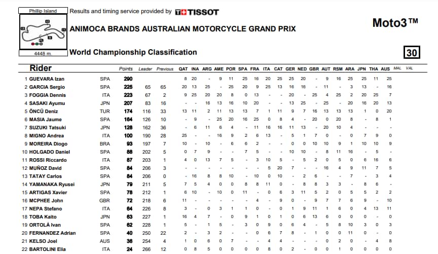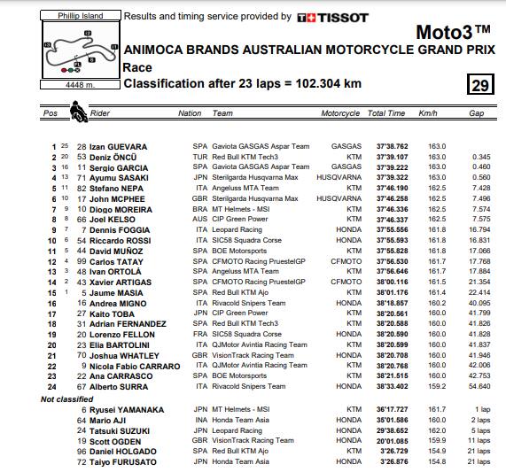 moto3Doppio trionfo per il giovane pilota del Team Aspar, che vince una splendida gara in rimonta a Phillip Island e conquista a 18 anni il titolo mondiale in Moto3: nel GP Australia lo spagnolo ha preceduto Deniz Oncu e il compagno di squadra (e rivale in classifica) Sergio Garcia. Capitolo italiani: 5° Stefano Nepa, solo 9° Dennis Foggia
