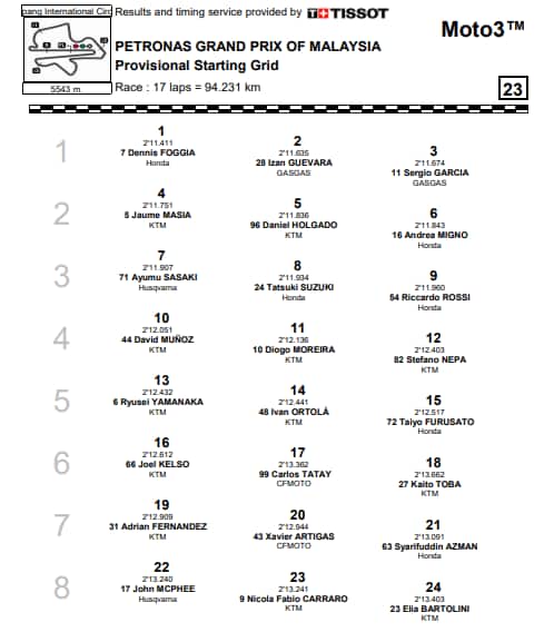 Moto3, la griglia di partenza del GP Malesia: