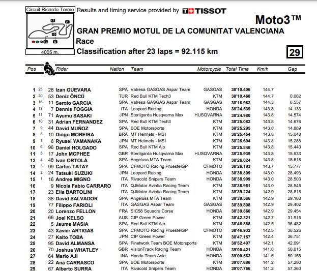 Izan, lezioni di guida anche all’ultima gara. Il campione del mondo impeccabile, lo sfidante un po’ meno. Oncu l’ha pedinato come un’ombra, studiandolo metro per metro, sondandone i punti i deboli. Ammesso che ce ne fossero. All’ultimo giro il turco ha infilato lo spagnolo all’interno, Guevara ha provato a resistere, ma ha chiuso per evitare un contatto e ha restituito il colpo all’ultima curva. Traiettoria perfetta per far correre veloce la sua Gas Gas, mentre Oncu allargava troppo la sua per vedersi infine sfilare lo spagnolo di fianco, primo sul traguardo. Il nuovo re della Moto3, già proiettato verso il salto di categoria, ha messo il sigillo finale sulla sua stagione perfetta, e poi s’è lasciato andare alla gioia davanti ai tifosi di casa. C’erano un paio di posizioni ancora aperte, partendo dal secondo posto in campionato, ma il suo compagno di squadra Garcia ha messo in cassaforte il titolo virtuale di vicecampione nei primi giri, piazzandosi subito al terzo posto, a distanza di sicurezza. Foggia, l’unico che poteva contenderglielo ha chiuso quarto: c’ha provato, ma è partito un po’ indietro e s’è trovato intruppato. Ha reagito nel finale, infilando anche Sasaki che sperava di soffiargli almeno il terzo posto nel Mondiale, ma Dennis d’astuzia ed esperienza se l’è tenuto dietro.