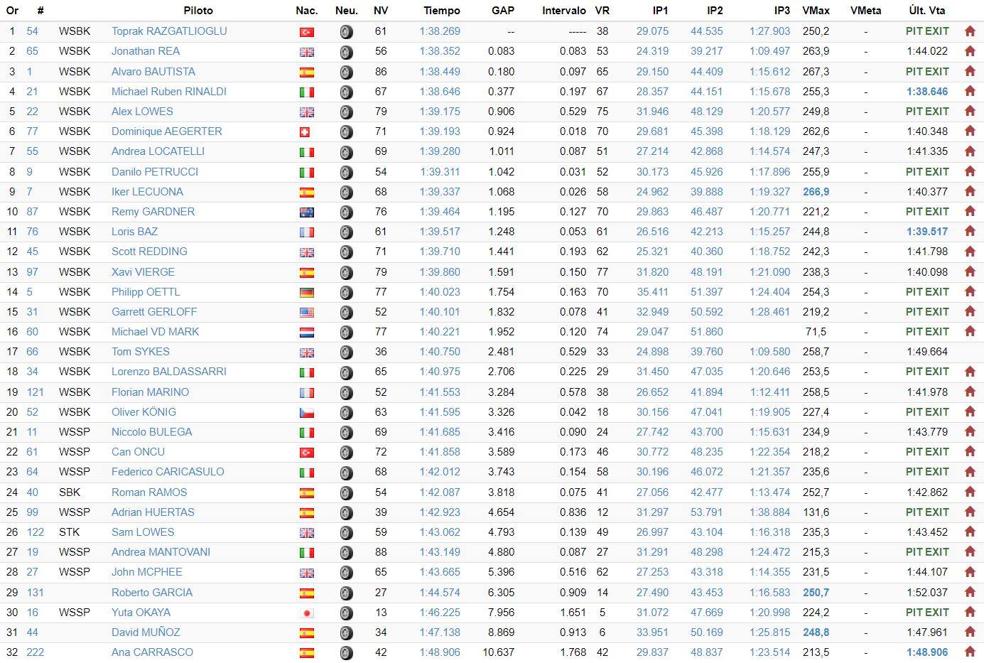 superbikeRazgatlioglu bissa la prima posizione di ieri e precede Rea. Bautista (3°) impressiona per la costanza, buona prestazione anche per Rinaldi (4°). In Supersport svetta nuovamente Nicolò Bulega