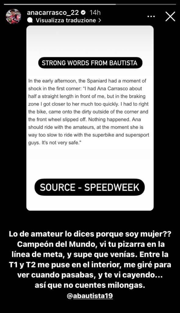 La campionessa di Supersport 300 del 2018 non l'ha presa bene e ha affidato la sua risposta ai suoi canali social. Ana ha accusato Bautista di averla accostata agli amatori in quanto donna e ha dato la sua versione dei fatti. "Campione del mondo, ho visto la tua tabella sul rettilineo e sapevo che stessi arrivando. Tra curva uno e curva due mi sono spostata all'interno della pista per lasciarti spazio, mi sono girata per vedere quando saresti passato e ti ho visto cadere. Non si raccontano menzogne".
