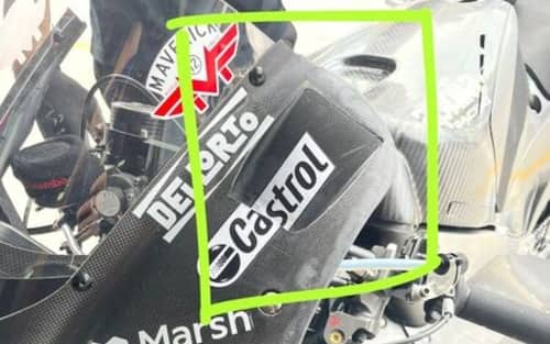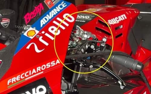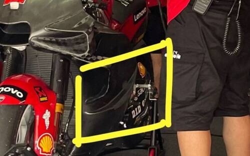 - La Ducati ha provato una nuova carena, che possiamo definire "effetto suolo": nella parte alta è stato sagomato un condotto chiuso da un profilo alare. I tecnici di Borgo Panigale, in questo modo, provano ad aumentare il carico aerodinamico in fase di piega e a sigillare ulteriormente la moto sull'asfalto generando maggior aderenza in curva