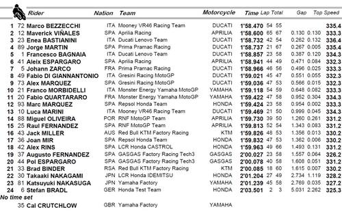 - Come detto sopra, Marco Bezzecchi è stato il più veloce di giornata. Più indietro il compagno di squadra Luca Marini, che ha chiuso 13° a circa un secondo di ritardo. I due piloti del Mooney VR46 hanno guidato la moto campione del mondo del 2022