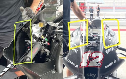 - Aprilia ha svolto un gran lavoro in inverno dal punto di vista aerodinamico. La RS-GP 23 ha evoluto la pancia della carena, che ora è più sagomata e ha un profilo superiore più marcato