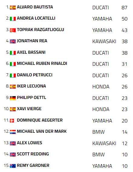Alvaro Bautista fa sua Gara 1 di Superbike a Mandalika e ottiene il primo successo per sé e per Ducati sulla pista indonesiana. Scattato terzo e con la grande incognita del consumo gomma, lo spagnolo ha montato le due soluzioni più morbide a disposizione (SC1 all’anteriore, SCX al posteriore) contro la scelta più conservativa dei rivali (SC2 e SC0). La sua magistrale gestione gli ha permesso di imporre un passo insostenibile, mantenuto fino alla fine della gara. Toprak Razgatlioglu non ha potuto arginarlo, pur con la pole position (la terza in tre anni a Mandalika). Il turco ha comunque concluso una grande gara al secondo posto, precedendo il solido Andrea Locatelli, che mantiene la seconda posizione in campionato e si conferma sul livello del più blasonato compagno di squadra. Grande prova anche per Axel Bassani e Danilo Petrucci, quarto e quinto con le Panigale V4 R di Motocorsa e Barni Spark. Una interessantissima rimonta nella seconda parte di gara ha consegnato il sesto posto a Michael Van Der Mark. L’olandese ha preceduto Xavi Vierge e Dominique Aegerter, mentre le due Kawasaki ufficiali di Jonathan Rea e Alex Lowes non vanno oltre le ultime due posizioni della top-10. La strada tecnica presa dal box verde, specialmente lato Rea, sembra aver fatto perdere la bussola al sei volte campione del mondo, costantemente alla ricerca di feeling e prestazione. Un punto per Lorenzo Baldassarri (15°), mentre Michael Ruben Rinaldi è caduto alla prima curva.