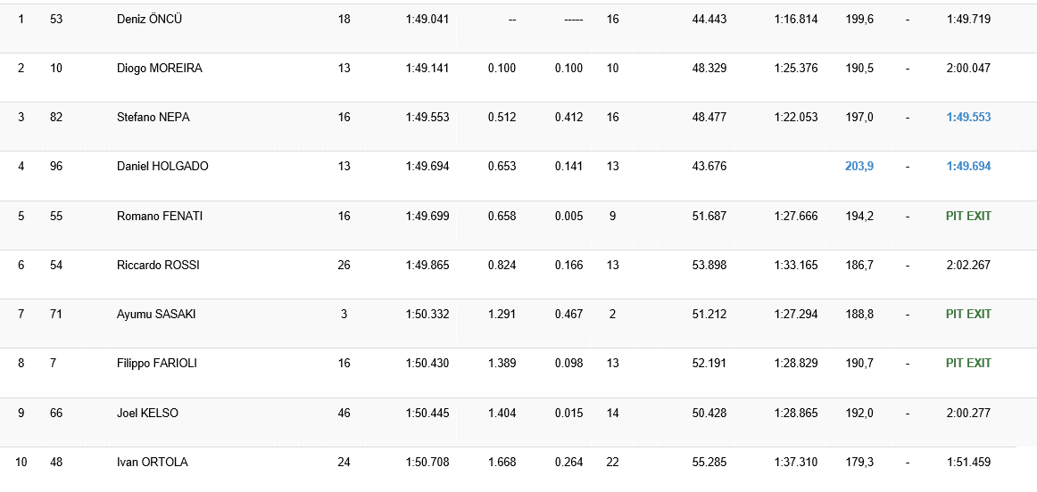 Tutti gli altri italiani sono in top 10, tranne Matteo Bertelle, anche lui al rientro da un lungo stop per un infortunio a un ginocchio. Romano Fenati, al ritorno con Snipers in Moto3, è una delle due Honda tra i primi dieci. In una classifica dominata dalle Ktm, Romano ha immediatamente ritrovato il feeling con la categoria, dove spera di fare un ultimo e definitivo passaggio per poi avere una nuova chance in Moto2. In sesta posizione, immediatamente dietro a Fenati, la seconda delle Honda, quella del team Sic58 Squadra Corse guidata da Riccardo Rossi. Non una sorpresa trovare questa coppia nelle prime posizioni, sia per le ambizioni importanti di Rossi dopo il bel finale di 2022, sia perché il circuito di Jerez è particolarmente affine alla sua squadra. Ultimo degli italiani in top 10 il rookie Filippo Farioli, che quest’anno ha l’obiettivo di giocarsi il riconoscimento di miglior debuttante della stagione. Ottavo alle spalle di quello che da tutti è considerato il favorito per il titolo, Sasaki, Farioli ha subito impressionato positivamente.