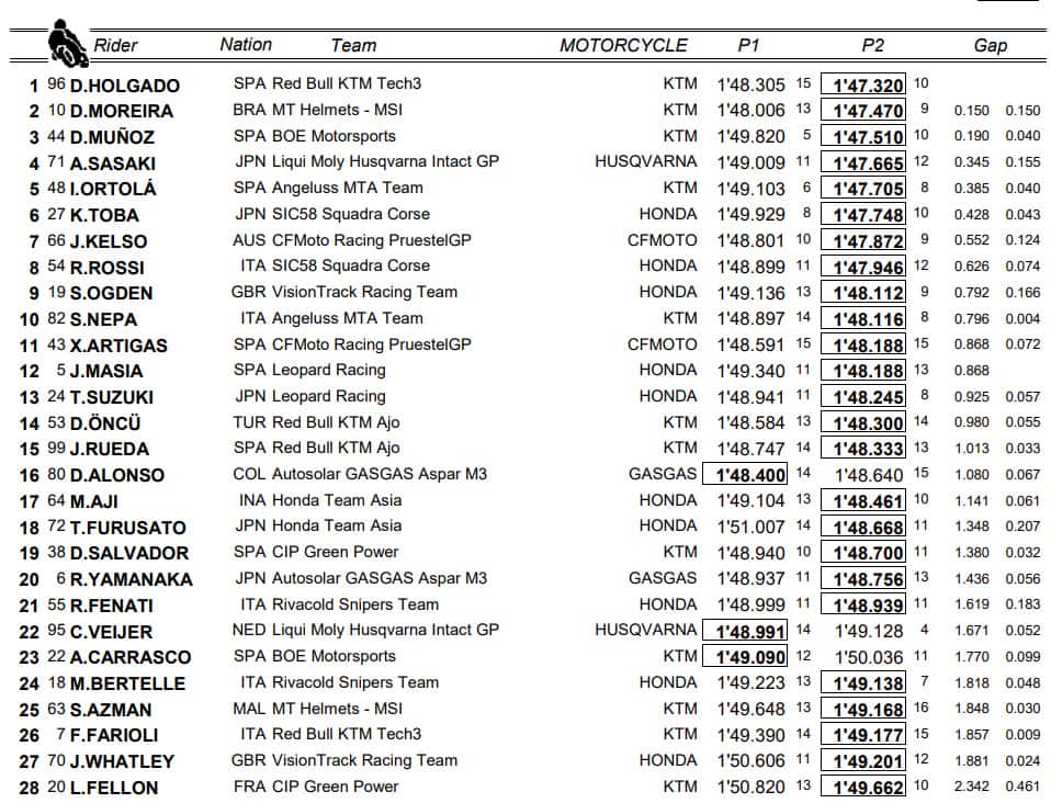 Holgado, Moreira, Munoz, la Moto 3 riparte da questi tre piloti. Due spagnoli e un brasiliano (Moreria) chiudono la prima fila virtuale nella giornata d’apertura a Portimao. Tutti in sella a moto Ktm, a ribadire la superiorità, salvo sorprese future, delle moto austriache. Dei big della scorsa stagione è rimasto Ayumu Sasaki, quarto al termine della passata stagione, quarto nel venerdì portoghese. Il giapponese corre con Husqvarna, una Ktm diversamente battezzata, tanto per rimarcare la differenza con la Honda che fino al sesto posto è di fatto inesistente. Kaito Toba, è il primo nome dell’ala dorata, Riccardo Rossi, ottavo il secondo. Il genovese, rimasto al team Sic58, si è piazzato in zona sicurezza (passano i primi quattordici alla Q1 di sabato), ma tutt’altro che soddisfatto: "Le Ktm hanno molta più aderenza". La scivolata del mattino, a sentire lui, è la conferma del suo desiderio di partire forte. “Sono qui per fare bene, sono partito all’attacco” ha spiegato con un filo d’amarezza per la posizone a fine giornata.