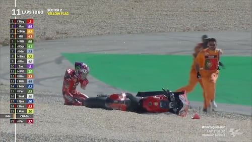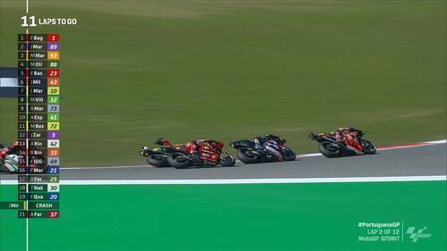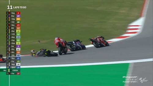 - La Sprint di Enea Bastianini è durata poco più di un giro: il pilota della Ducati ufficiale, travolto da Luca Marini, ha subito una frattura alla scapola destra e non prenderà parte alla gara di domenica 26 marzo a Portimao e, molto probabilmente, nemmeno al weekend dell'Argentina. La speranza è di rivederelo in pista ad Austin, il 14-16 aprile. Intanto lunedì 27 marzo si sottoporrà a una visita medica e si deciderà se dovrà essere operato