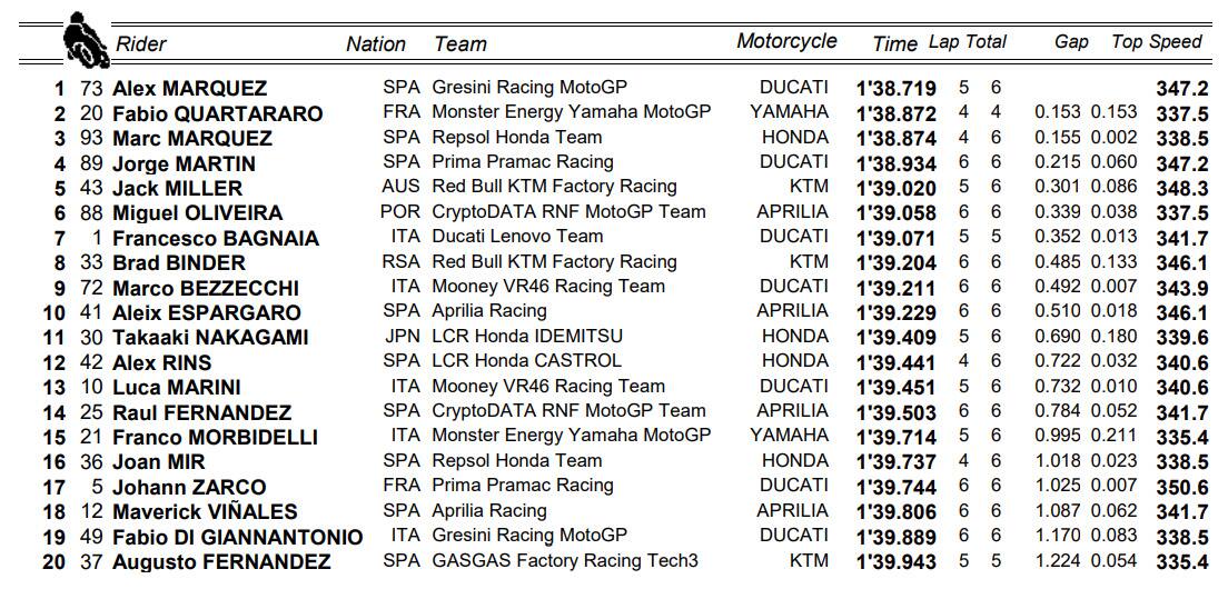 portimaoAlex Marquez è stato il più veloce nel warm up del GP del Portogallo. A Portimao il pilota del Team Gresini chiude in 1'38''719 ,precedendo la Yamaha di Quartararo, che si era fermato al primo giro per un problema tecnico. Terzo Marc Marquez, che scatterà dalla pole, settimo Bagnaia con la Ducati. Ecco tutti i tempi. Alle 15 la gara in diretta su Sky Sport Uno, Sky Sport MotoGP e in streaming su NOW