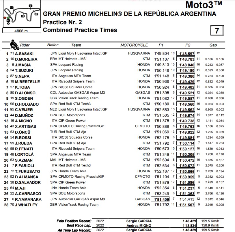 C’è Ayumu Sasaki al comando dopo il primo giorno di prove in Argentina. Il giapponese, che in Portogallo era rimasto fuori dalla volata per il podio, punta a rifarsi a Termas de Rio Hondo dove le Ktm (e assimilate come Husqvarna e CF Moto) dettano il passo. Alle sue spalle si è piazzato l’unico brasiliano in corsa nel Motomondiale, Diogo Moreria che in Algarve aveva concluso la gara al terzo posto. Jaume Masia chiude la prima fila virtuale: lo spagnolo del team Leopard, sottotono al debutto, è il primo delle Honda, sul circuito sudamericano dove le moto giapponesi sembrano pagare meno il gap con le rivali austriache. Alle sue spalle il suo compagno di squadra Suzuki, a parziale conferma di un maggiore equilibrio tecnico. Bene ha fatto anche Stefano Nepa, il migliore degli italiani, col 5° tempo davanti a Bertelle, forse favorito da una scia. Quindi Kaito Toba, 7°, portacolori del team Simoncelli, solo 10° Holgado vincitore della prova portoghese. Dentro i 14, ma col 12° cronologico, David Munoz, finito sul podio a Portimao, ma meno efficace fin qui.