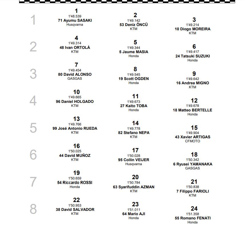 Giornata no per gli italiani, migliore dei quali si è infine rivelato Andrea Migno, rientrato alle corse come sostituto temporaneo dell’infortunato Fellon. Il romagnolo partirà dalla terza fila con il nono tempo, davanti ad leader del mondiale Holgado, ulteriore soddisfazione. "Mi tengo il sorriso sulle labbra perché mi sto divertendo - ha detto Andrea -. Sono lì tra i migliori". L’unica per i tifosi italiani, che devono rassegnarsi a veder scattare più indietro il resto della pattuglia tricolore. Bertelle partirà dalla dodicesima posizione, Stefano Nepa, quinto fino a un minuto dal termine, è infine scivolato al quattordicesimo posto. Riccardo Rossi solo 19°, Romano Fenati, velocissimo con la pista in parte bagnata, non ha superato la Q1 in condizioni normali e partirà quindi 24°.