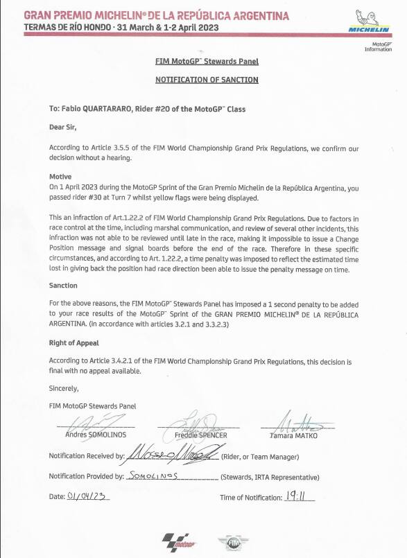 la decisioneUn secondo di penalità sul tempo della gara sprint in Argentina: questa la penalità inflitta a Fabio Quartararo per aver sorpassato Nakagami in regime di bandiere gialle in curva 7. Ma il risultato al traguardo del pilota Yamaha, che ha chiuso al nono posto con un secondo e 3 decimi di margine sulla 10^ posizione di Jack Miller, non cambia