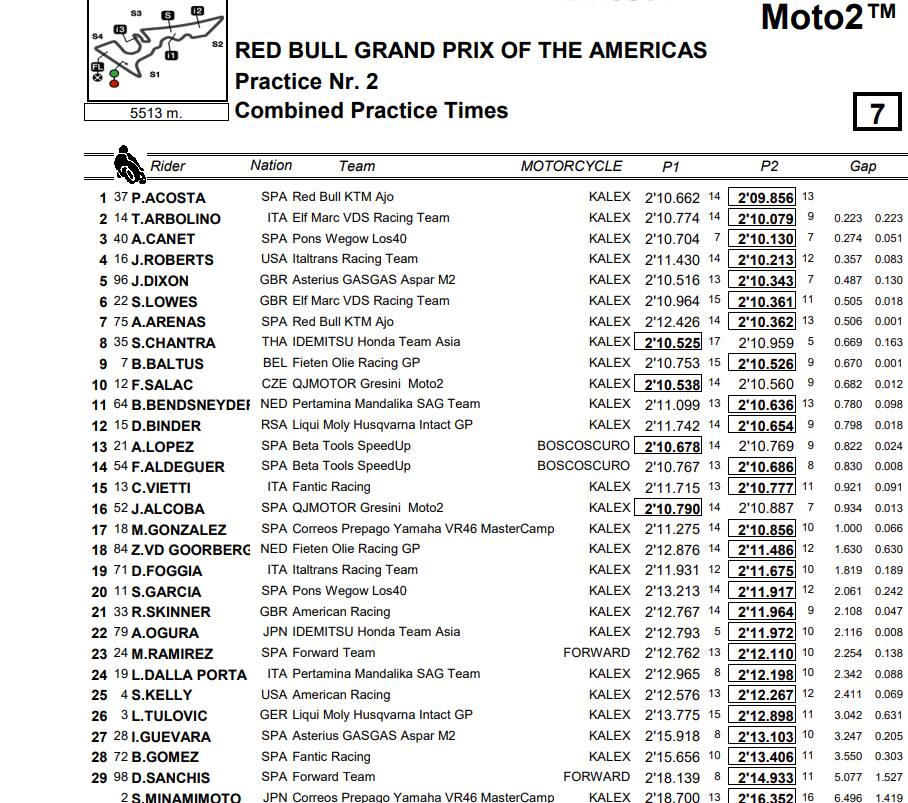 gp americhePedro Acosta ha realizzato il miglior tempo nel venerdì di prove libere ad Austin, al termine di una seconda sessione condizionata dalla pioggia: 2° il leader del Mondiale Arbolino, 3° Canet. Al momento esclusi dalla top 14 Celestino Vietti (15°) e Dennis Foggia (19°)