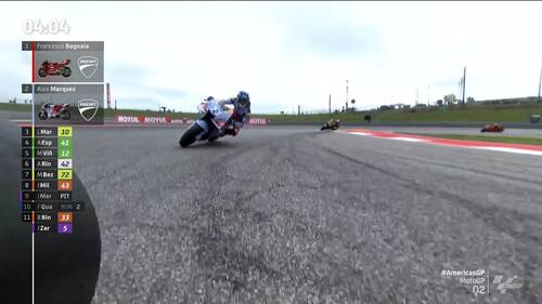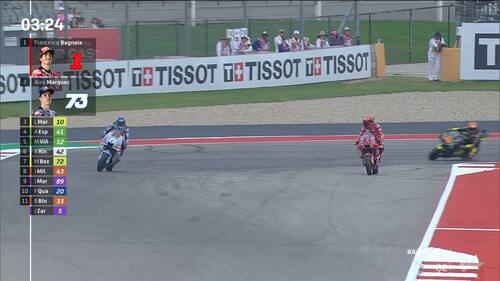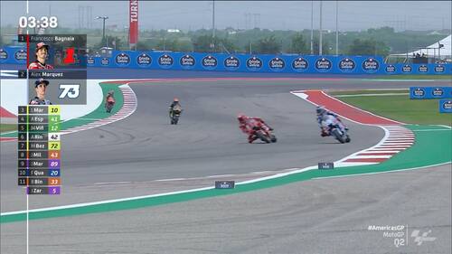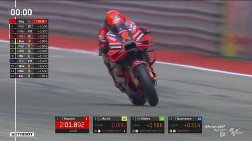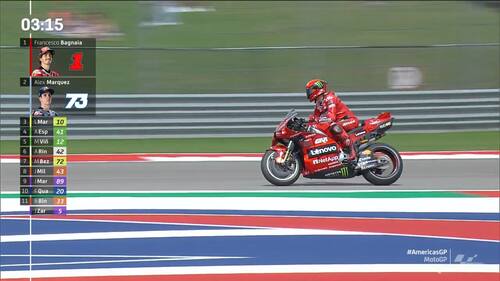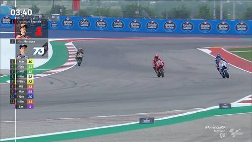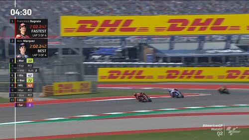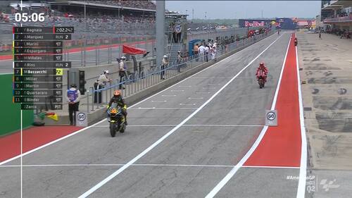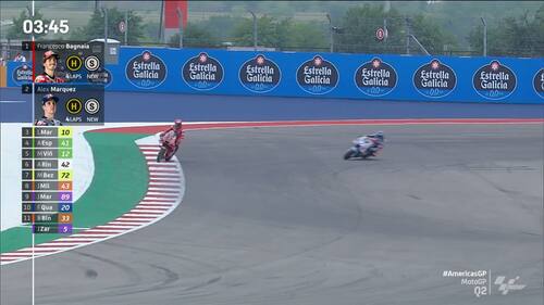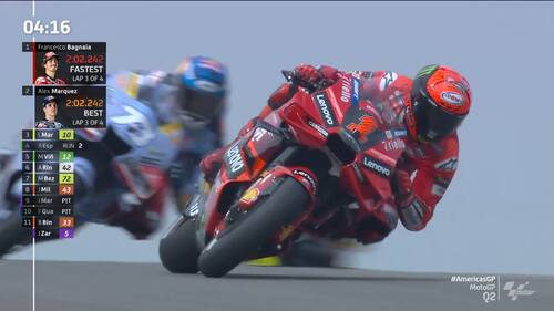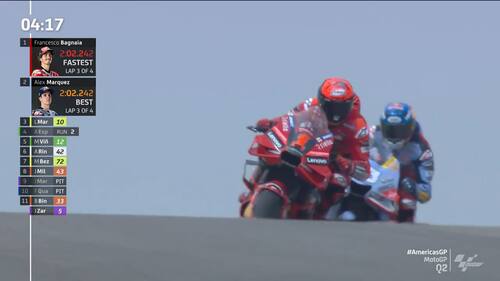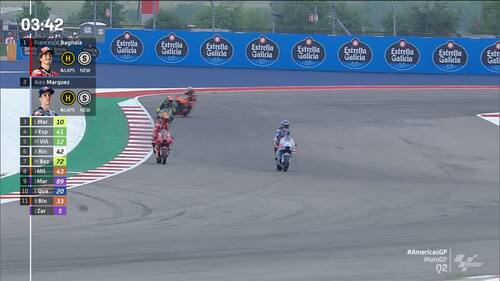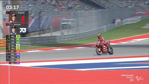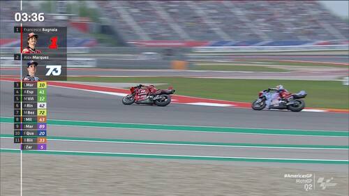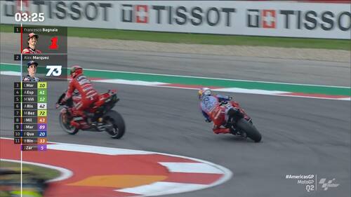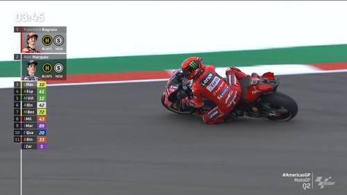 - Alex Marquez tuttavia rallenta e si lascia superare da Bagnaia, ribadendo la volontà di sfruttare la scia di Pecco per provare a centrare la pole del GP delle Americhe